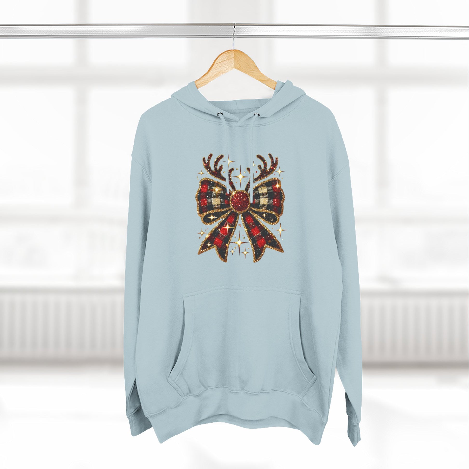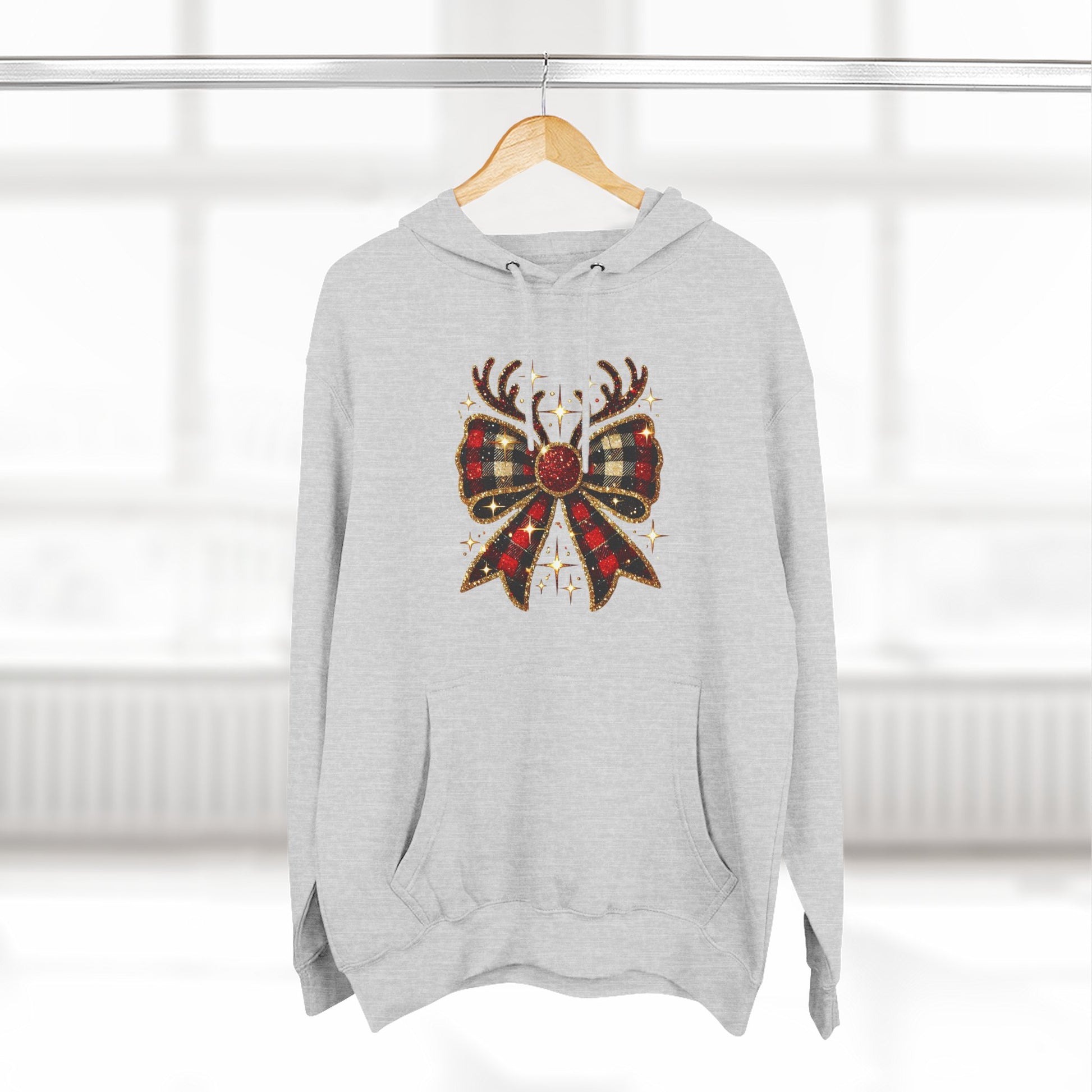 Celebrate the holidays in style with our Christmas Reindeer Hoodie – cozy fleece, cute plaid bow, perfect festive gift for her, and winter apparel.