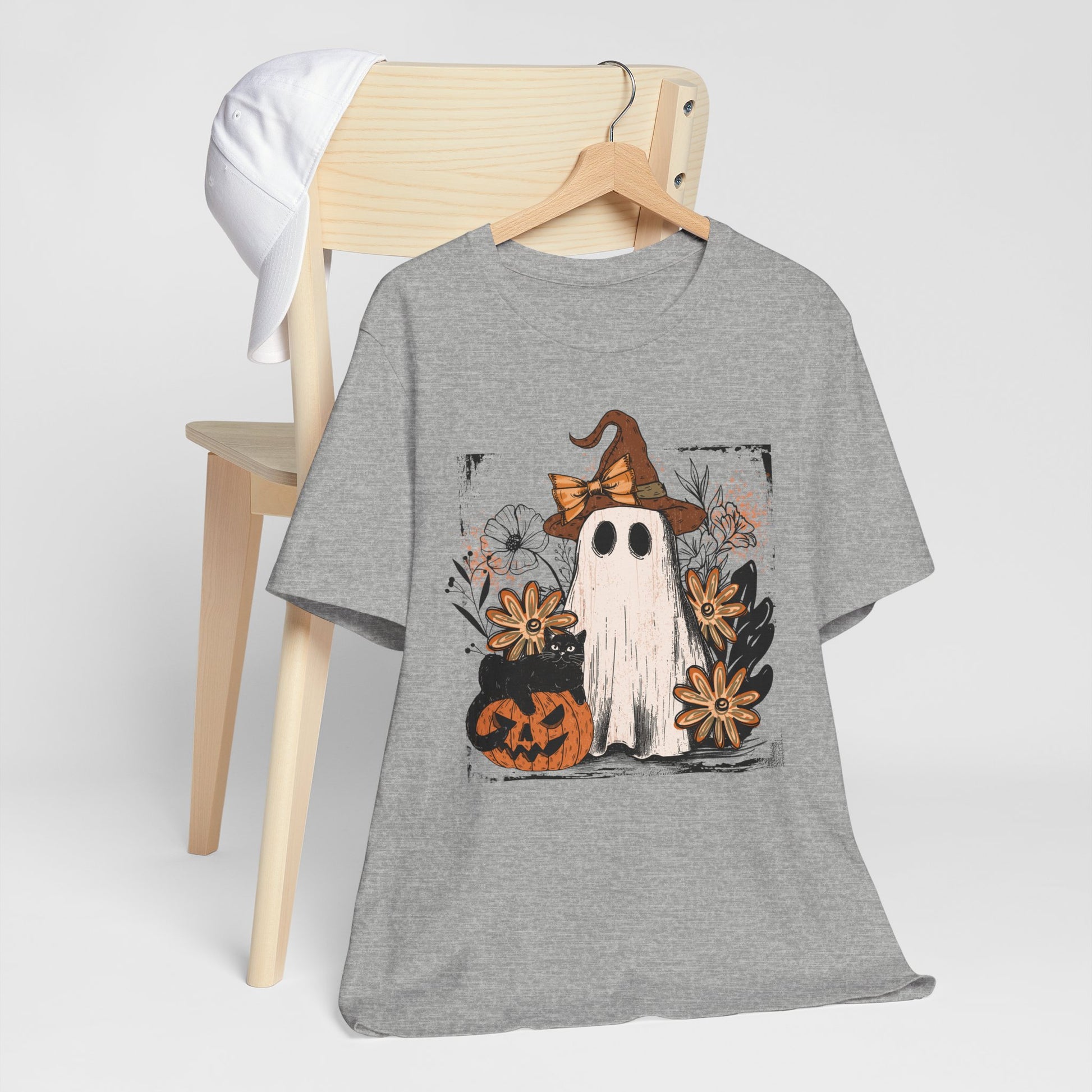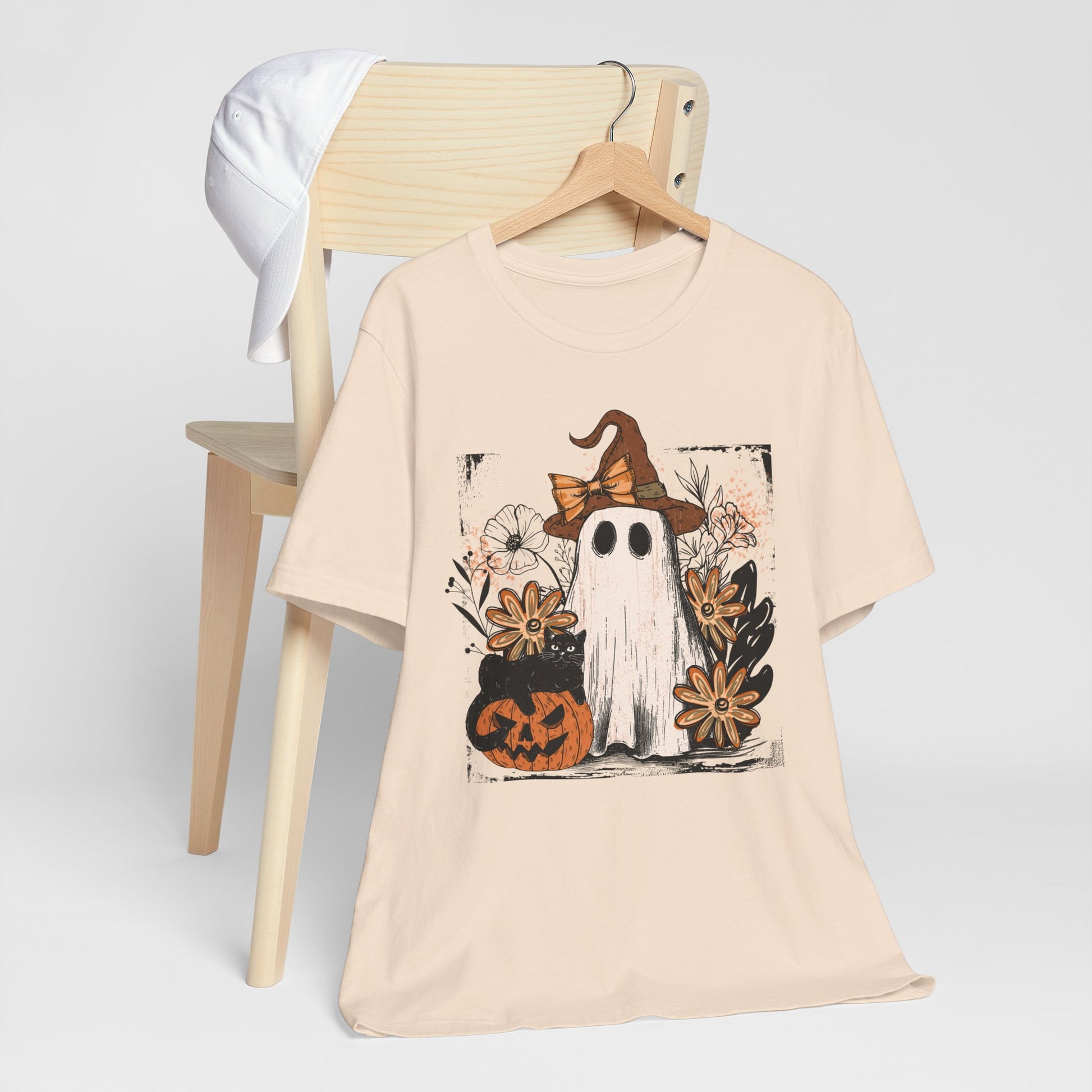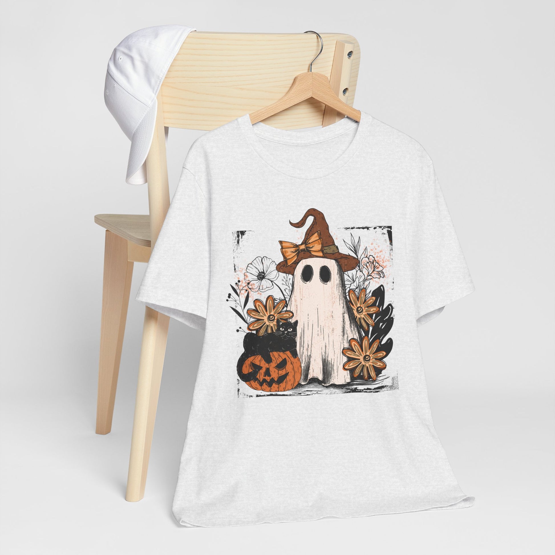 Get into spooky season style with our Halloween Ghost Graphic T-Shirt – trendy fall fashion and the perfect outfit for parties, costumes, or casual wear.