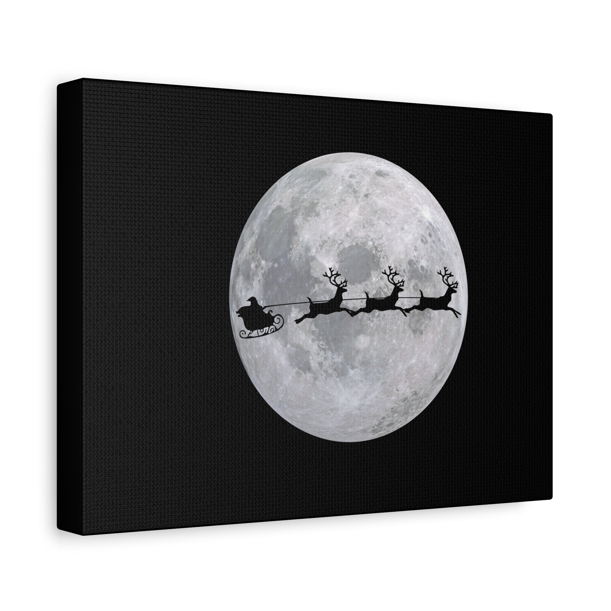 A matte stretched canvas print that captures a quiet, midnight moment: a luminous full moon set against deep black, with the silhouette of Santa’s sleigh and reindeer gliding across its face. The subtle texture of the cotton-poly canvas and the low-profile 1.25" frame give the image a gallery-ready presence while keeping it approachable and warm. Hang it above a mantel, in a child’s bedroom, or on a hallway wall to add a gentle, nostalgic holiday mood that feels like the hush before a snowfall. The piece arrives ready to hang with a sturdy inner pine frame, soft rubber support dots to keep it steady, and archival-quality inks for lasting color.