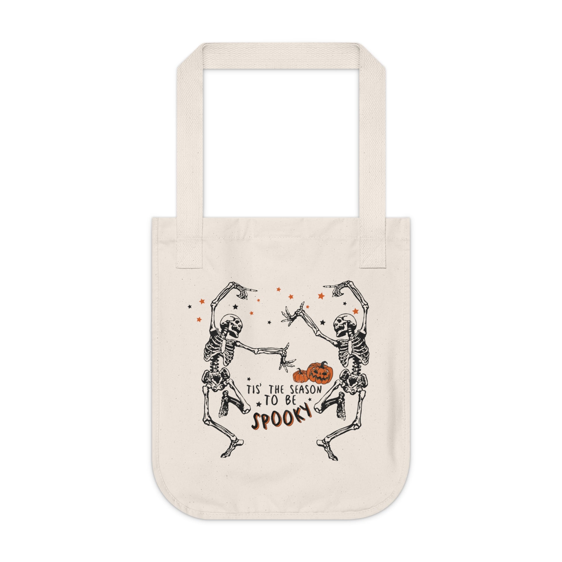 Spooky Season Organic Canvas Tote Bag with skeleton art design, ideal for Halloween shopping or trick or treating. Eco-friendly and made from 100% Certified Organic Cotton. Fits all your essentials in its spacious interior. Perfect gift for those who love Halloween festivities.